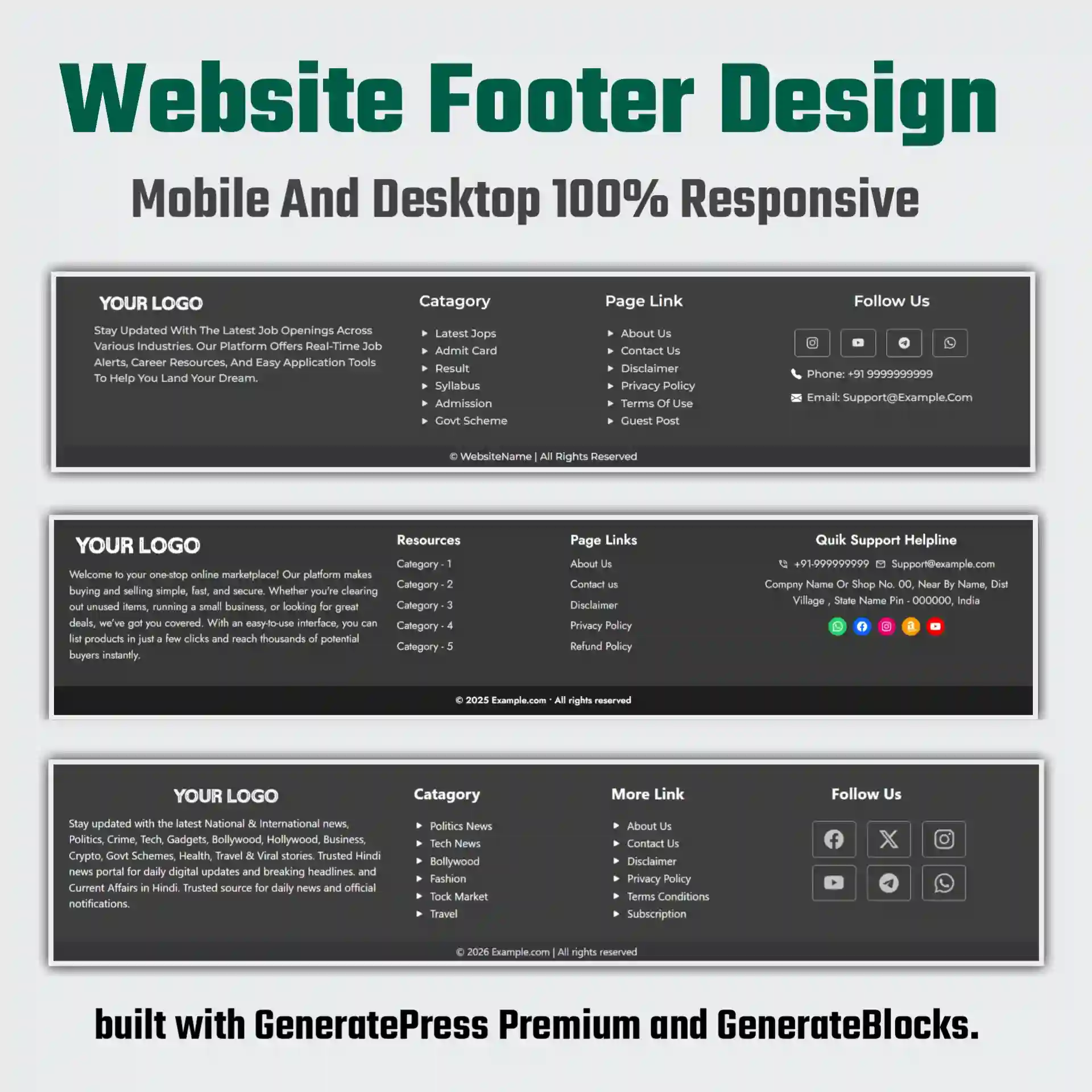 This lightweight footer widget is built with GeneratePress Premium and GenerateBlocks. It is fully responsive for both mobile and desktop, and gives a Google PageSpeed score of 90-100. Being an AdSense-friendly design, it offers fast loading, clean layout, and distraction-free structure, which is perfect for both user experience and ad visibility. All you have to do is import the element file, and the design will be activated immediately. It is also easy to customize—logo, text, links, everything can be updated to Responsive Footer Design for GeneratePress Template.
