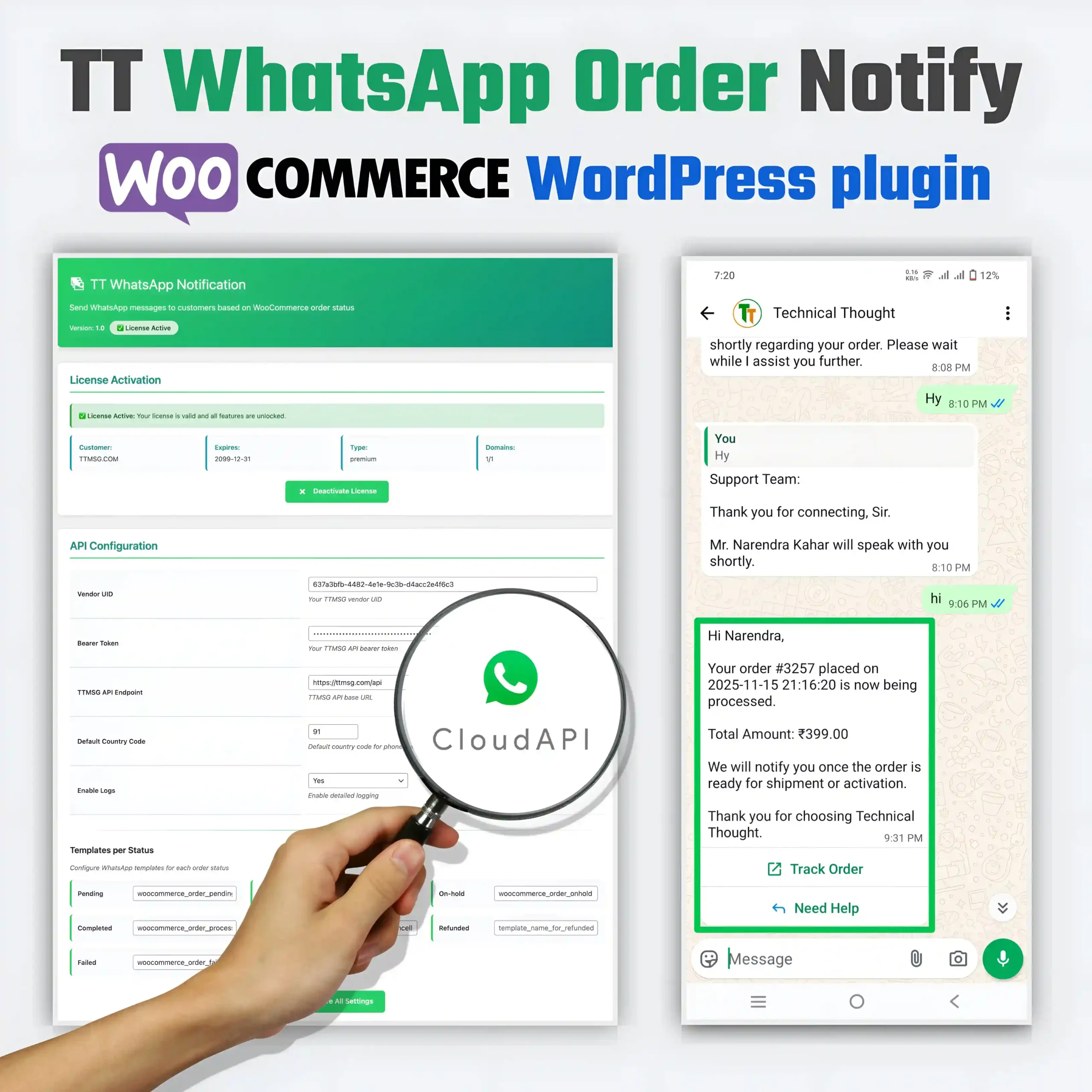 TT WhatsApp Order Notify is a professionally developed WordPress plugin developed by Technical Thought team. This plugin is specifically designed for WooCommerce store owners who want to send automated WhatsApp notifications to their customers.